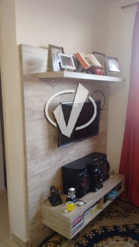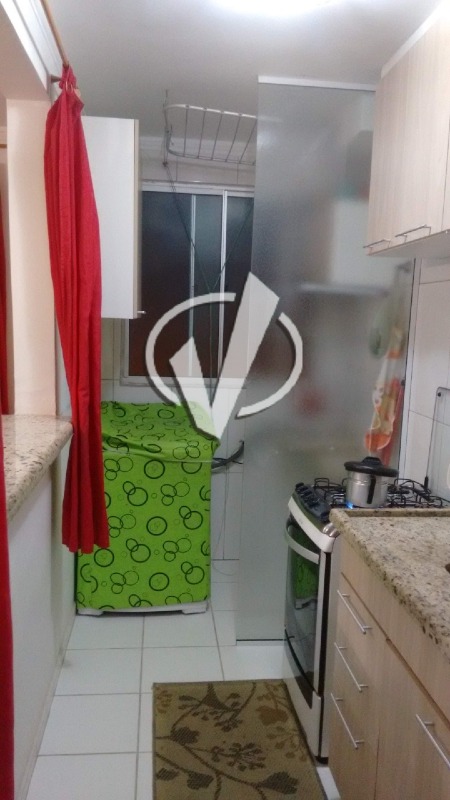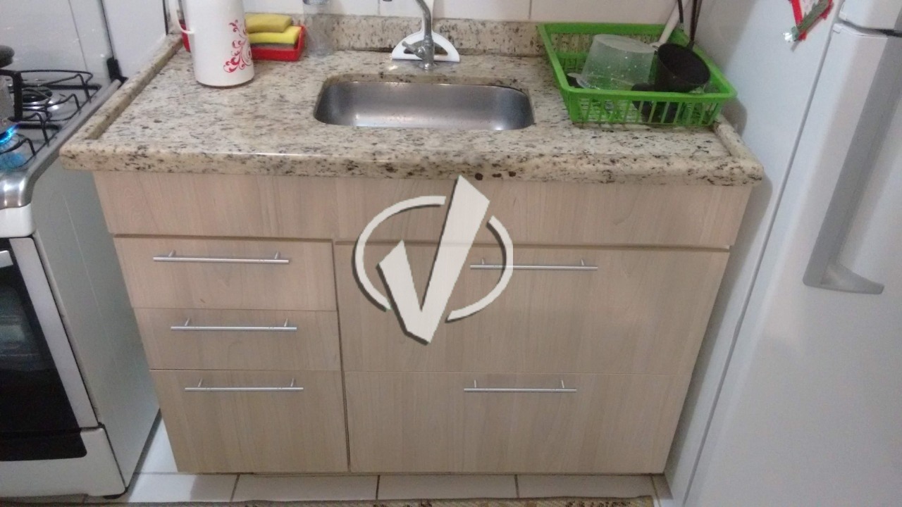 Apartamento com dois dormitórios, um banheiro, sala em dois ambientes, cozinha planejada e área de serviço.