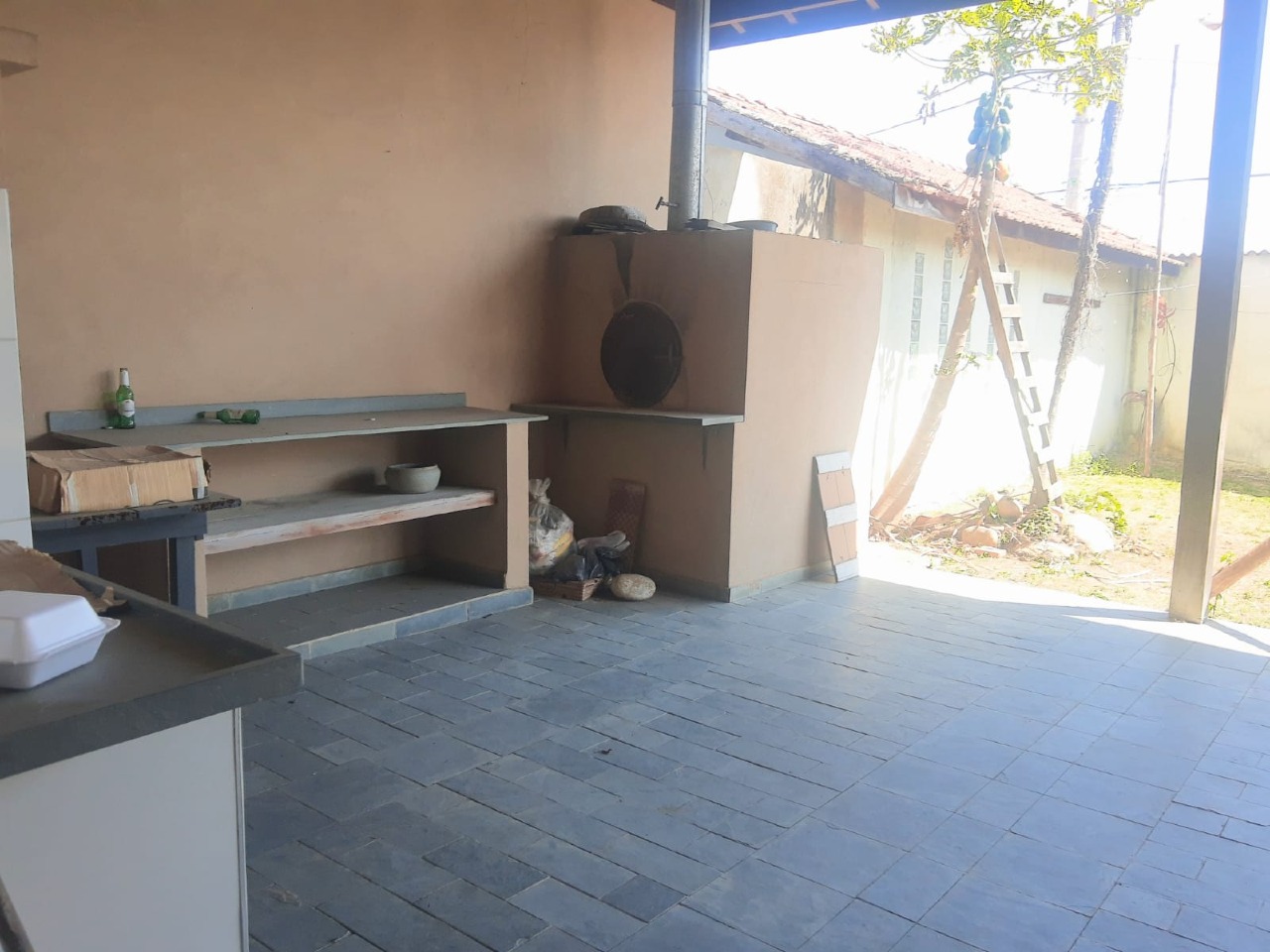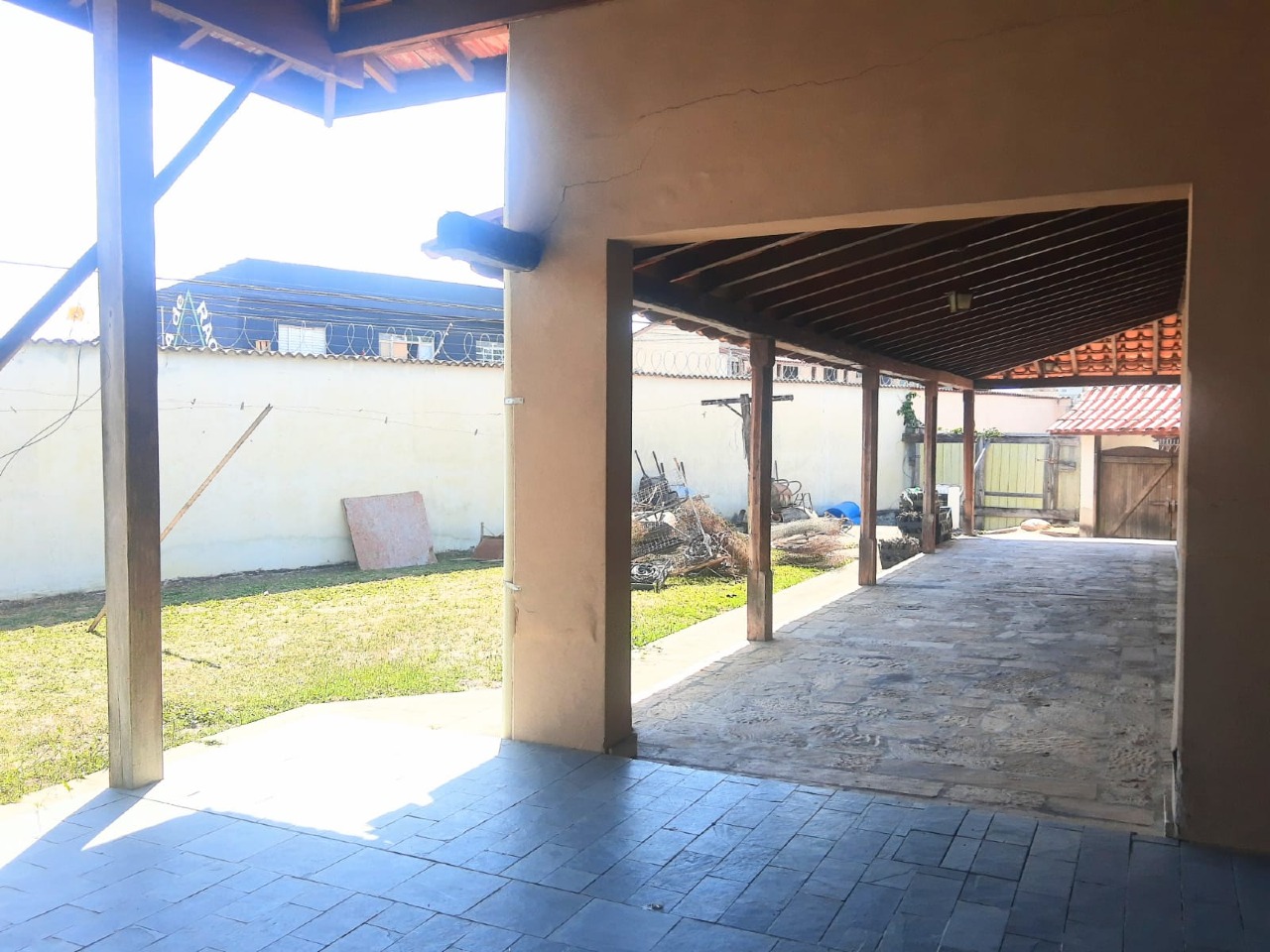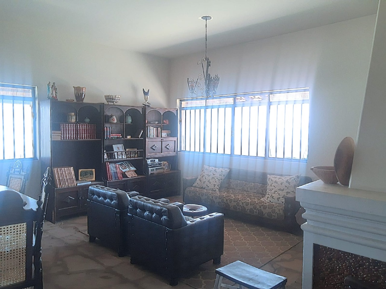 Casa principal: cozinha, copa, sala grande com lareira, 02 banheiros sociais, 02 suítes com armários e 02 dormitórios.